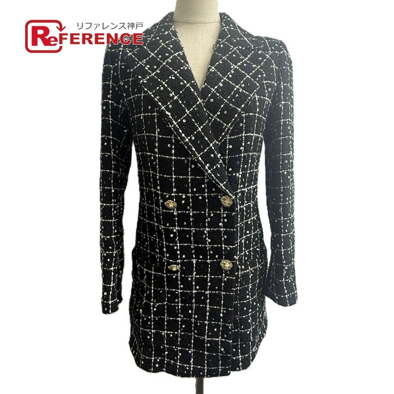 【美品】シャネル 黒色 CHANEL シャネル P75797 23-24AW カメリアボタン アパレル アウター ロング ツイード ジャケット ツイード レディース ブラック 【中古】