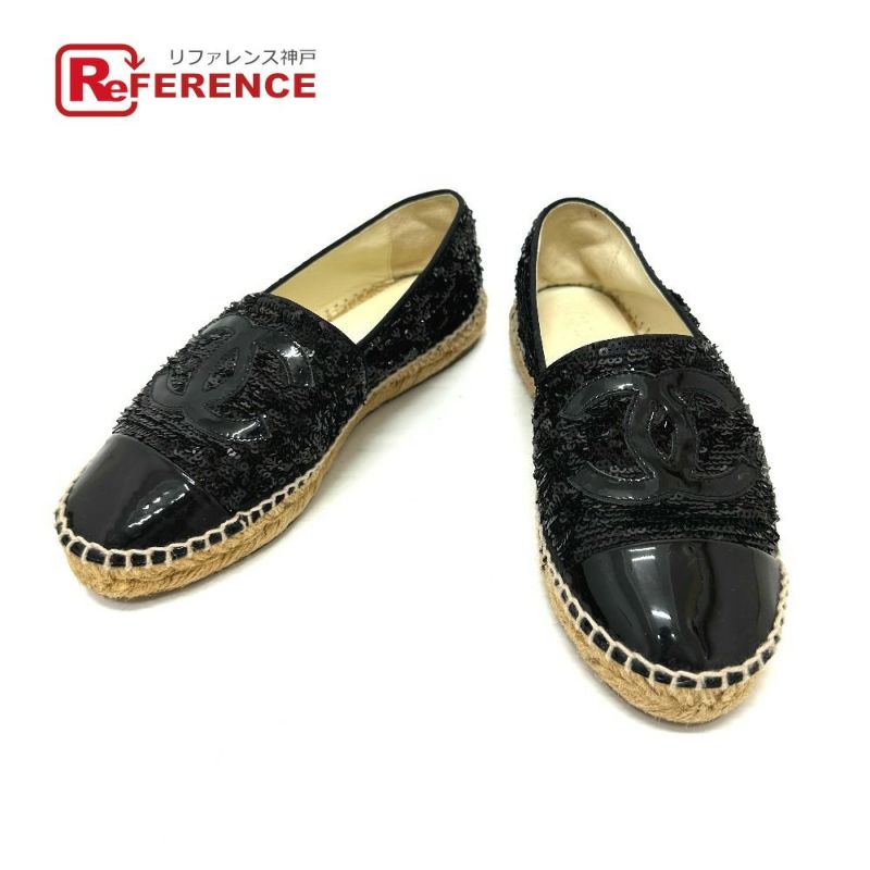 【中古良品】シャネル 黒色 CHANEL シャネル G29762 CCココマーク 16C スパンコール スリッポン フラットシューズ 靴 シューズ エスパドリーユ パテントレザー /スパンコール レディース ブラック 【中古】