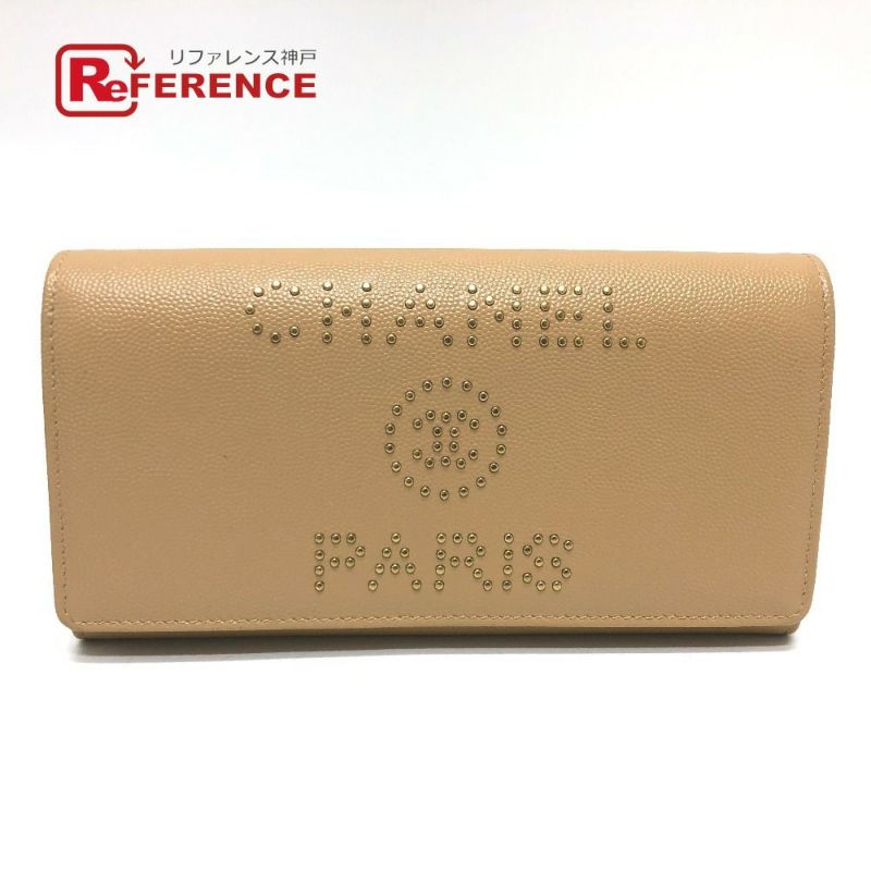 【中古良品】シャネル 薄茶色 CHANEL シャネル ロングウォレット スタッズ ロゴ 2つ折り 長財布 キャビアスキン レディース ベージュ 【中古】