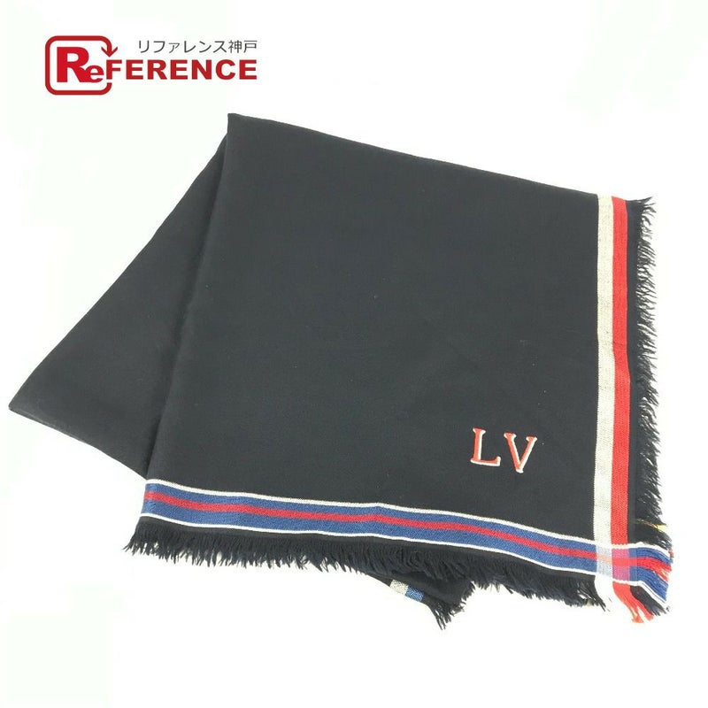【中古良品】ルイヴィトン 紺色 LOUIS VUITTON ルイヴィトン MP1702 LVロゴ 大判 フリンジ ショール マフラー ストール ウール /シルク レディース ネイビー 【中古】