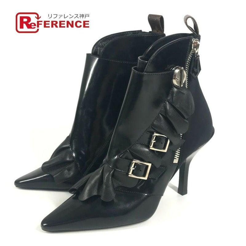 【美品】ルイヴィトン 黒色 LOUIS VUITTON ルイヴィトン 不明 モノグラム フリル ショートブーツ 靴 シューズ ブーティ ブーツ レザー レディース ブラック 【中古】