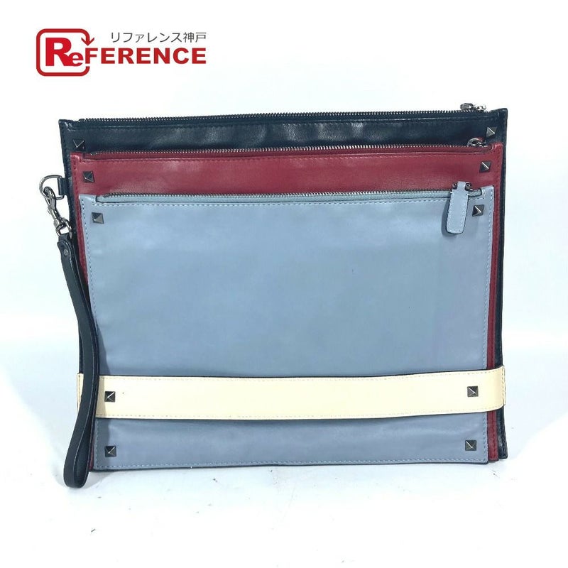 【中古良品】ヴァレンティノ 黒色 VALENTINO ヴァレンティノ スタッズ 3連 セカンドバッグ トリコロールカラー カバン クラッチバッグ レザー ユニセックス ブラック 【中古】