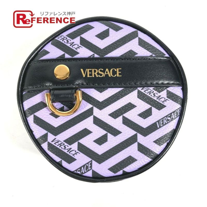 【未使用】ヴェルサーチ 紫色 VERSACE ヴェルサーチ 総ロゴ ラグレカ ラウンド メイクポーチ 化粧ポーチ マルチポーチ ポーチ レザー レディース パープル 未使用 【中古】