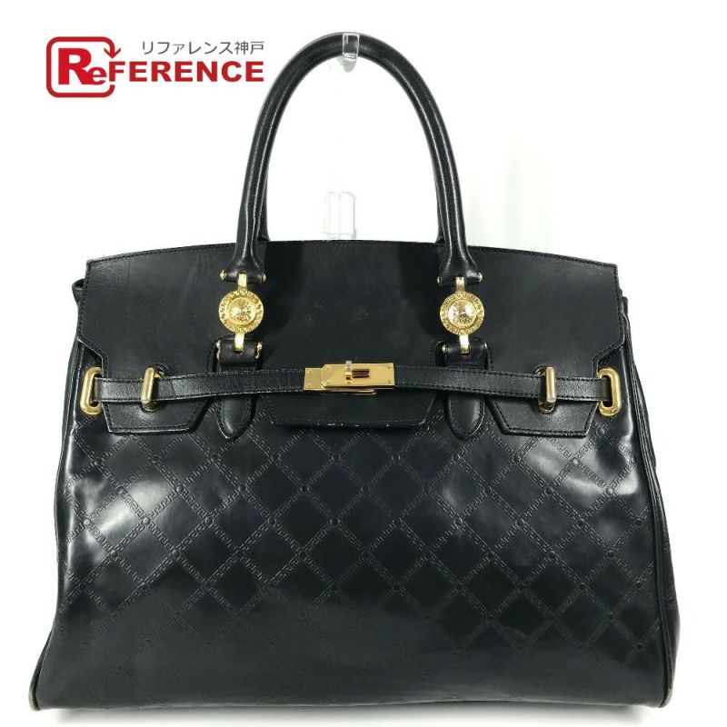 ヴェルサーチ 黒色 VERSACE ヴェルサーチ ヴィンテージ サンバースト ロゴ トートバッグ 2WAYバッグ ハンドバッグ ショルダーバッグ レザー レディース ブラック 【中古】